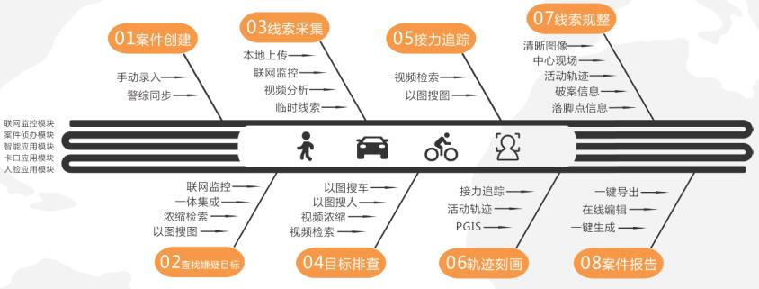 智慧警务综合应用平台是基于视频结构化、大数据处理等核心技术,通过对视频图像中涉及到的“行人、机动车、人骑车、人脸”四类实战元素进行特征提取、标注解析处理,结合公安实战业务,打造“视频联网监控、案件侦办研判、视频智能应用、卡口应用、人脸识别比对”等五大基础功能模块,通过整合业务数据和流程,为用户提供视频侦查的全链条解决方案。