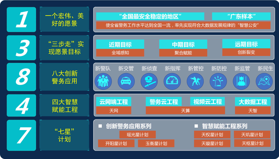 2018年1月,广东省公安厅在深圳召开全省公安机关“智慧新警务”建设会议,决定将全面推进全省新一代移动警务建设应用作为“智慧新警务”的关键载体和重要支撑,作为打通大数据应用“最后一公里”的重要工具。根据总体规划,就是描绘智慧新警务一个宏伟、美好的愿景,按照“三步走”的步骤实现愿景目标,提出八大创新警务应用和四大智慧赋能工程,最后通过推动“七星”计划实现愿景目标。
