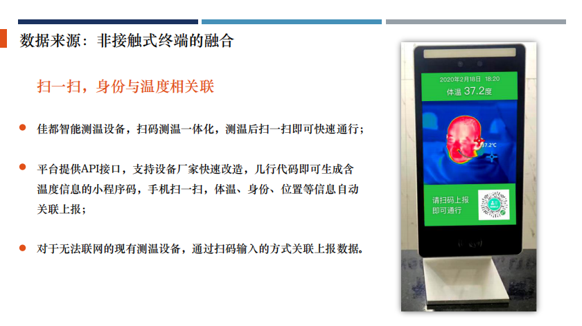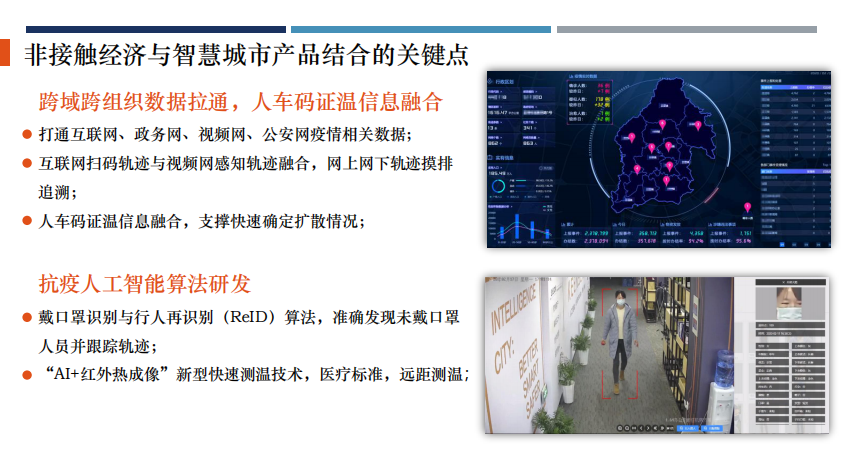 佳都科技智慧城市业务群产品经理袁名人分享了“非接触经济跟智慧城市新产品结合”的案例。“非接触型经济”已然崛起,其中的技术代表在对抗疫情过程中,发挥着重要的作用。数据采集,如测温、人脸等,加之与视频、地图等方面的融合,将在各个场景中达到非接触效果的最大化。而这些数字化、智能化的沉淀,正在以”非接触“的形式惠及更多的行业与社会公共事务。